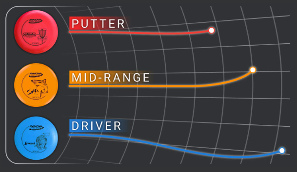 ![]() Влучні (Putters): Ці диски товстіші та найбільш гнучкі, що дозволяє їм летіти повільніше та стабільніше. Вони використовуються для коротких кидків та кидків у кошик. |