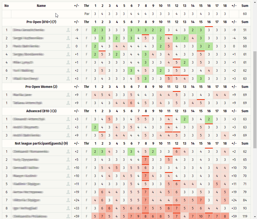 На цій таблиці приклад результатів гри 1го раунду турніру. Ми бачимо 4 дивізіони гравців, та їх результати по кожному з кошиків. У кожного ігрового курсу є рекомендована кількість кидків, і на цьому курсі їх 60. Деякі гравці зробили менше, і в них від'ємний результат (це добре), а дехто зробив більше (у них результат більше нуля).